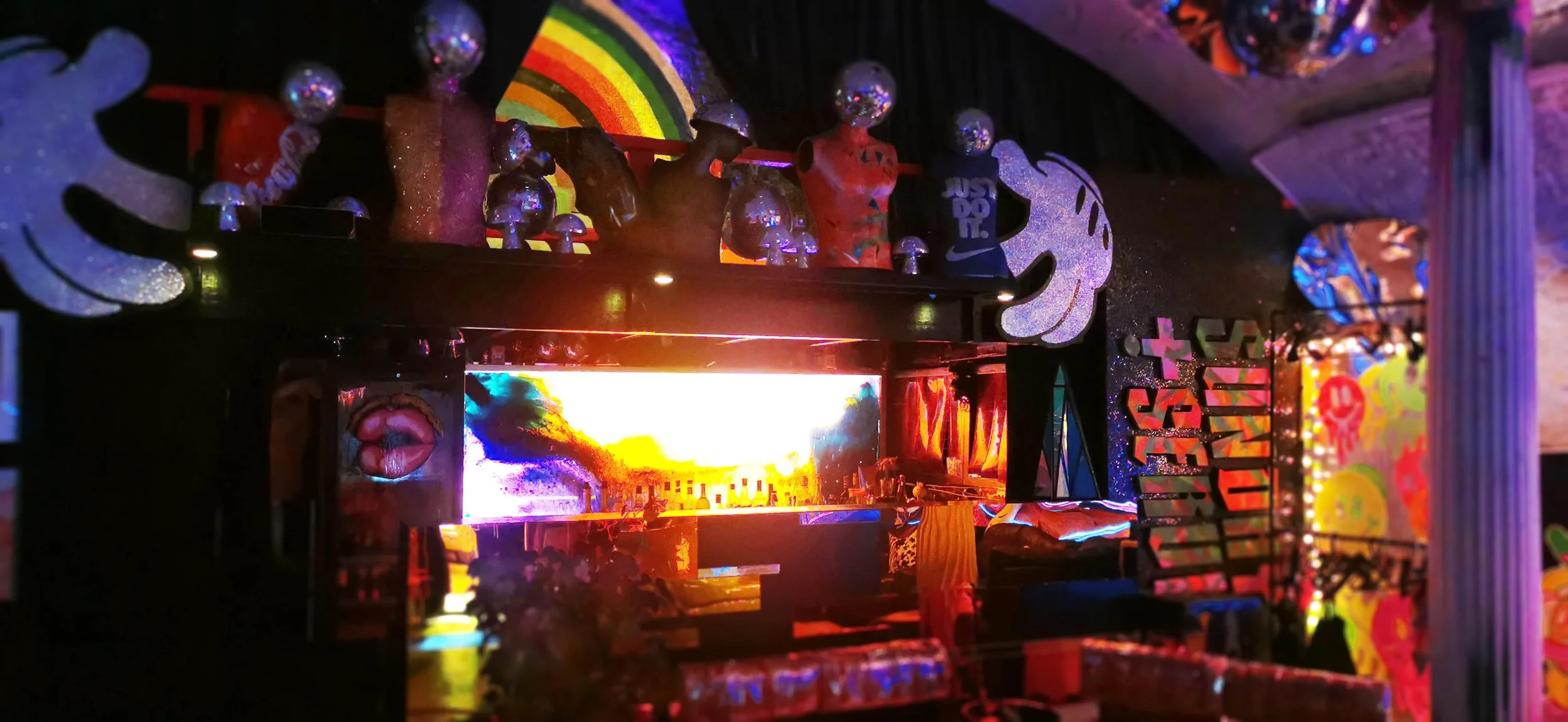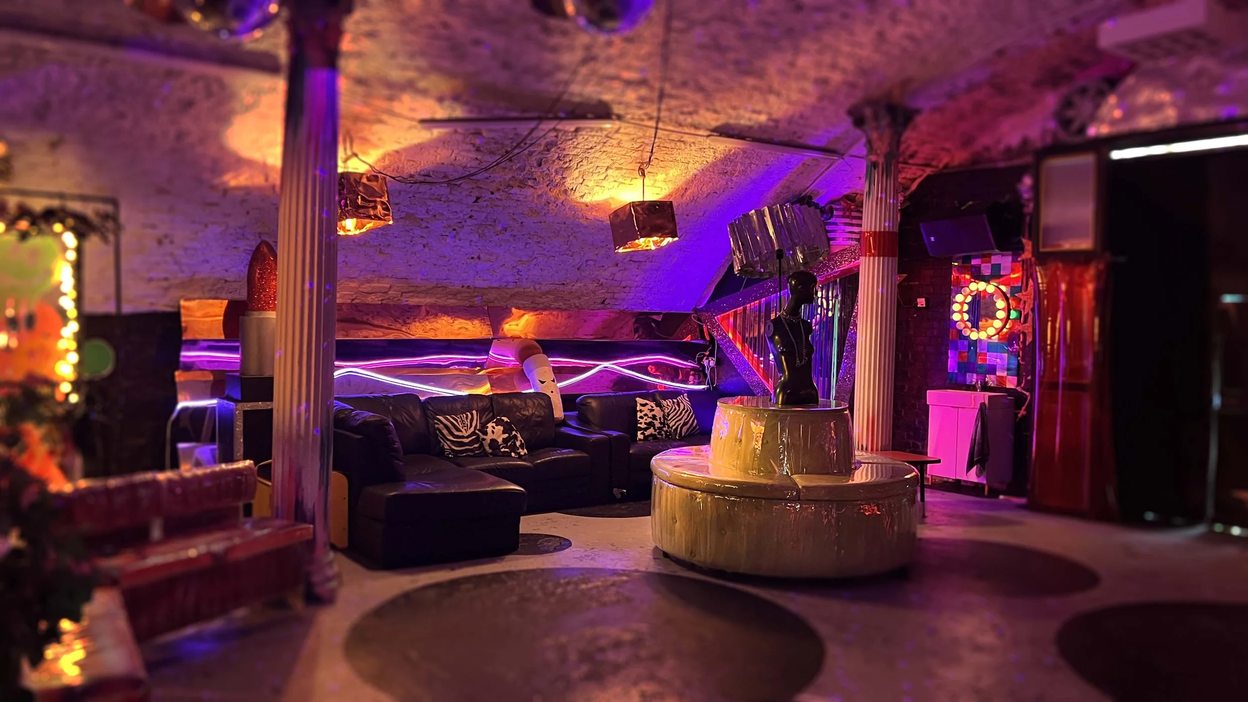 Ground floor access / Large double door entry / Mezzanine lounge / Bar / DJ booth / Pioneer XDJ-RR all-in-one / Mackie sound system (double stack) / Unique decor (neon lights, disco balls, glitter signs) / Haze machine / Toilet x 1 / WiFi
